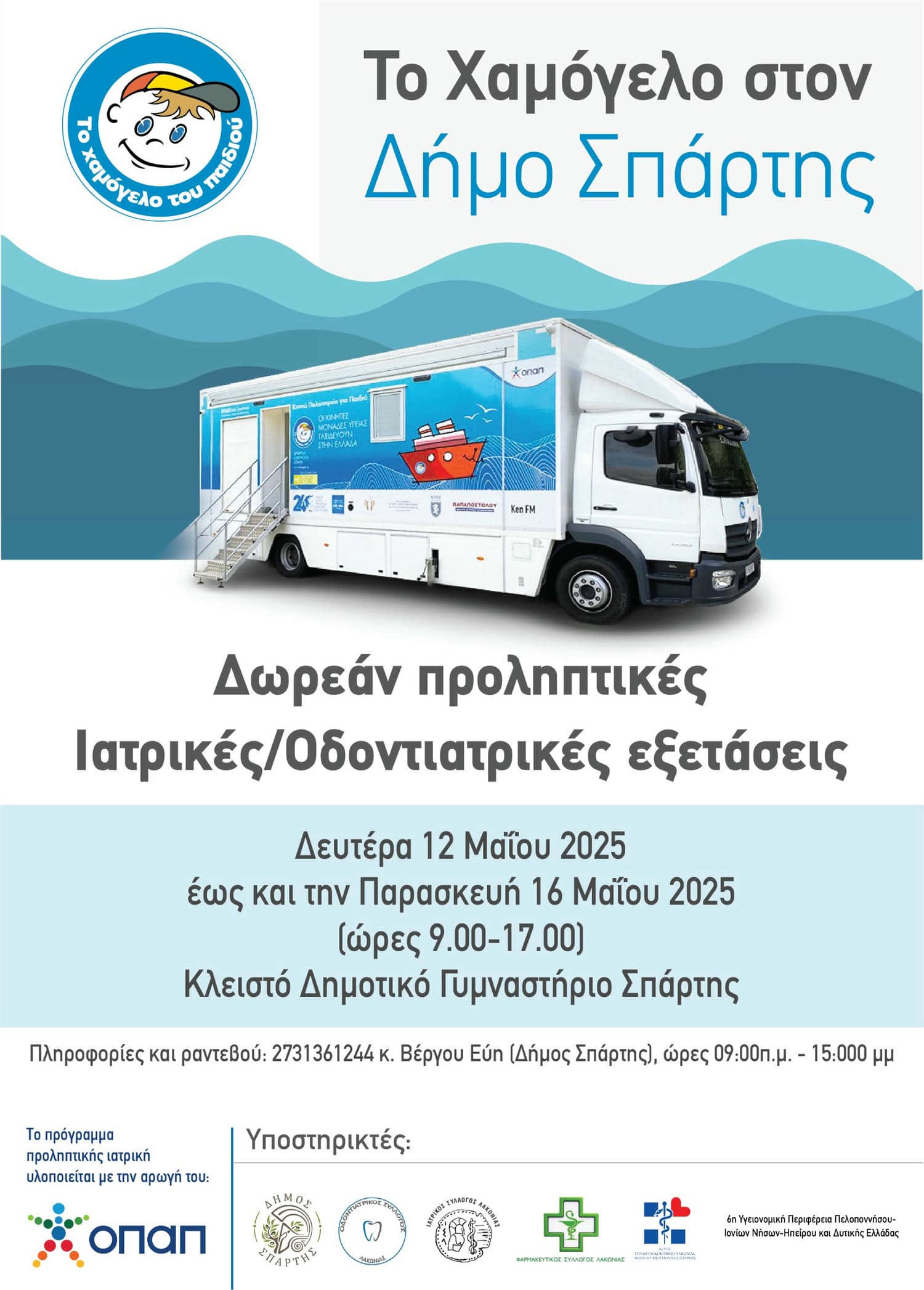 Δωρεάν προληπτικές εξετάσεις σε παιδιά και μαθητές θα προσφέρουν από την Δευτέρα 12 Μαΐου έως και την Παρασκευή 16 Μαΐου 2025, ο Δήμος Σπάρτης σε συνεργασία με «Το Χαμόγελο του Παιδιού».