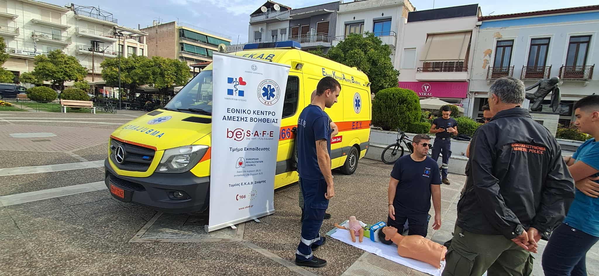 Διασώστες, νοσηλευτές και ιατροί του ΕΚΑΒ έκαναν επίδειξη στην Καρδιοπνευμονική Αναζωογόνηση (ΚΑΡΠΑ) αλλά και στη χρήση του Αυτόματου Εξωτερικού Απινιδωτή (CPR/AED), για την υποστήριξη της καρδιακής λειτουργίας και την επιβίωση των θυμάτων καρδιακής ανακοπής, κάνοντας χρήση προπλασμάτων και εκπαιδευτικών απινιδωτών.