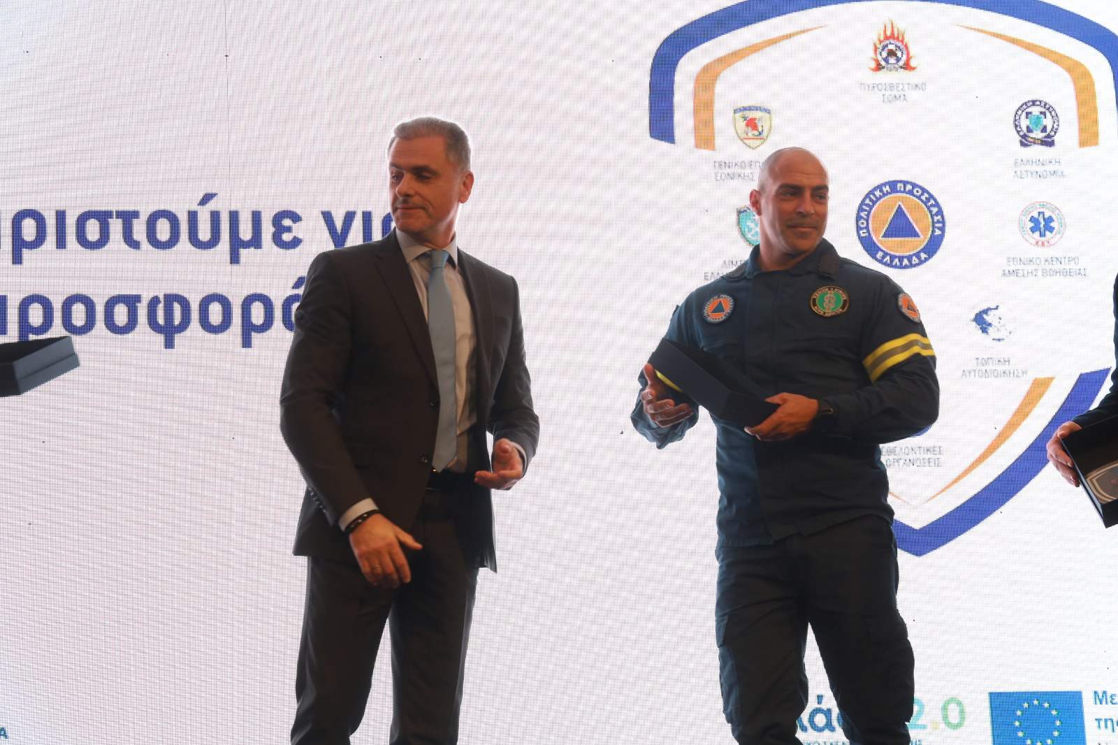 Τα βραβεία παρέλαβαν ο Αντιδήμαρχος Πολιτικής Προστασίας Σπάρτης, κ. Δημοσθένης Κακούρος και ο Υπάλληλος της Πολιτικής Προστασίας, κ. Ηλίας Κούρος, οι οποίοι εξέφρασαν τις ευχαριστίες τους προς τον Υπουργό για την αγαστή συνεργασία τους και την απονομή της τιμητικής διάκρισης.