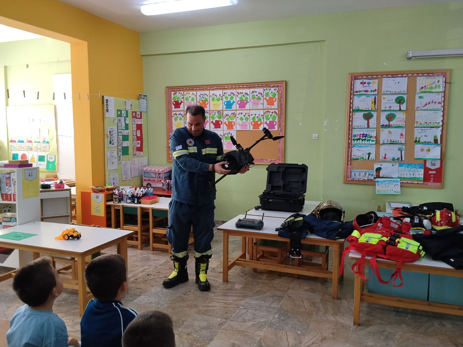 Έδειξαν στα παιδιά τον εξοπλισμό που χρησιμοποιεί η Πολιτική Προστασία, όπως το ντρόουν, το οποίο μεταδίδει απευθείας εικόνα από τις περιοχές ενός συμβάντος στο Επιχειρησιακό Κέντρο της Πολιτικής Προστασίας του Δήμου, τον εξοπλισμό τεχνικής διάσωσης, καθώς και τον εξοπλισμό διάσωσης σε ορμητικά νερά, τις ειδικές στολές, τα σωσίβια, τα κράνη κ.λπ. Ενθουσιασμένα τα παιδιά έμαθαν για τον εξοπλισμό που χρησιμοποιεί η Πολιτική Προστασία, ενώ συμμετείχαν και σε επίδειξη ρίψης νερού.