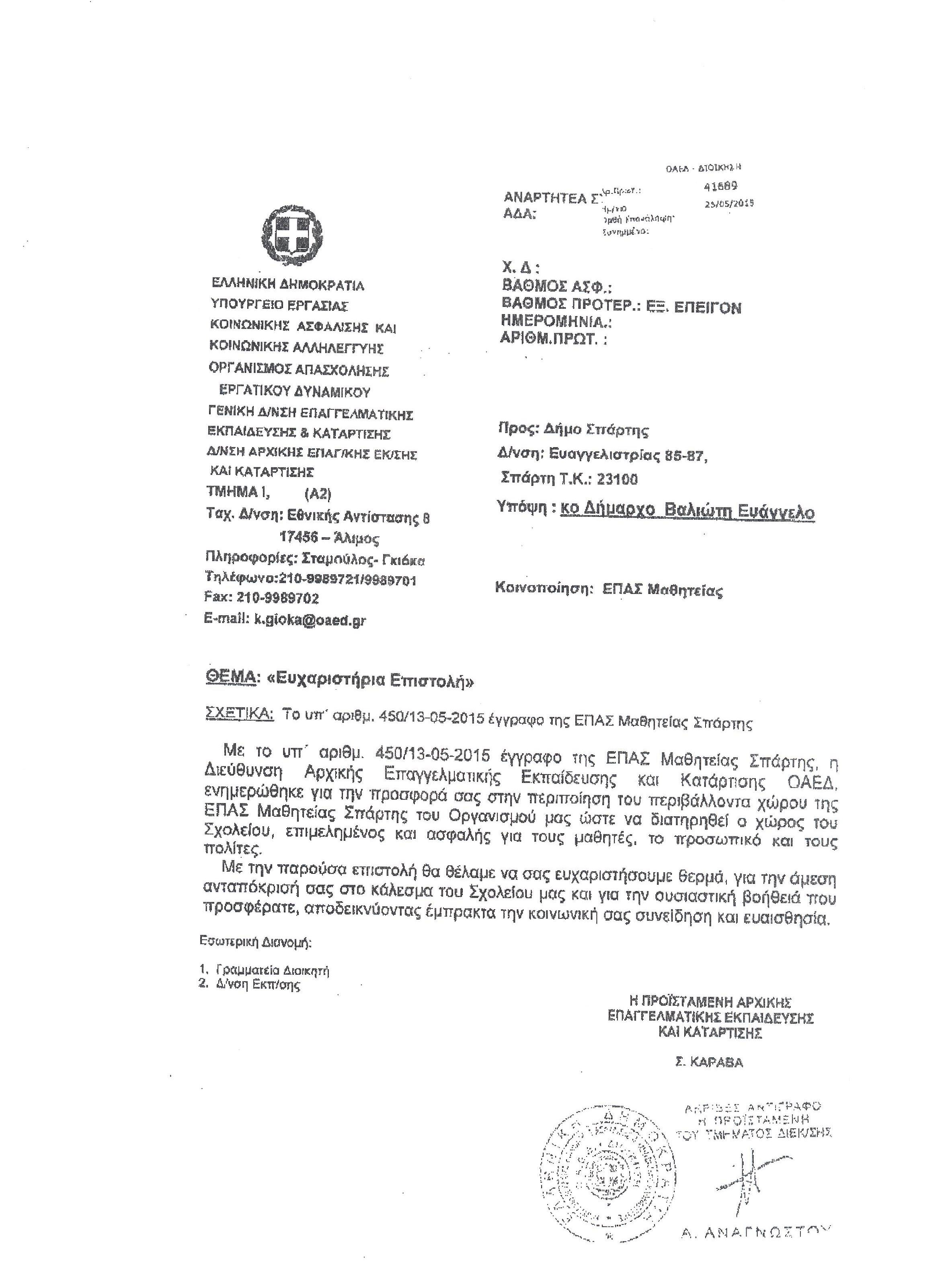 Ευχαριστήρια επιστολή έλαβε ο Δήμος Σπάρτης από τον ΟΑΕΔ, για την προσφορά του στην περιποίηση του περιβάλλοντα χώρου της ΕΠΑΣ Μαθητείας Σπάρτης.