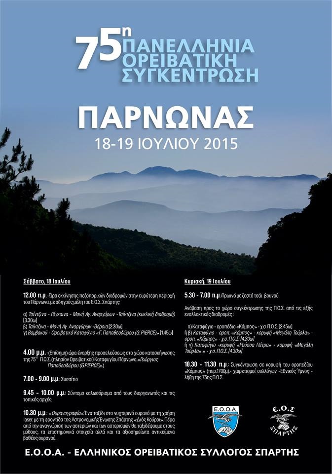 Η φετινή 75η Π.Ο.Σ στην οροσειρά του Πάρνωνα, στην κορυφή Μεγάλη Τούρλα στις 18 και 19 Ιουλίου 2015, θα δώσει μία ευκαιρία συνάντησης ορειβατών και πεζοπόρων, όλων των ηλικιών και διοργανώνεται από τον Ε.Ο.Σ. Σπάρτης, σε συνδιοργάνωση με την Ελληνική Ομοσπονδία Ορειβασίας-Αναρρίχησης (Ε.Ο.Ο.Α) το Νομικό Πρόσωπό Πολιτισμού Αθλητισμού & Περιβάλλοντος του Δήμου Σπάρτης, και το Δήμο Σπάρτης.