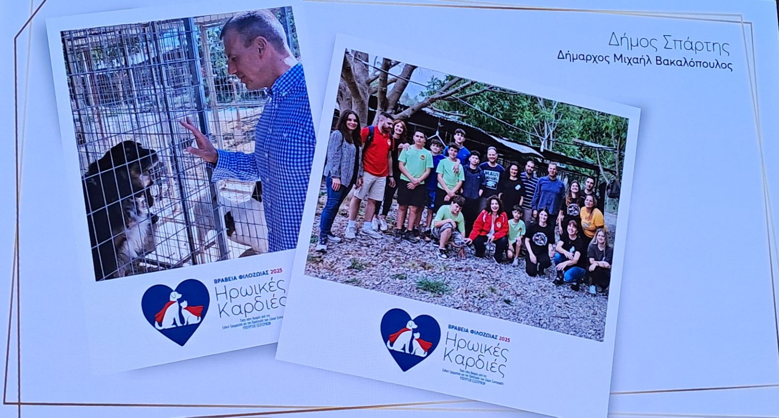 Έμπρακτη αναγνώριση του έργου που έχει συντελεστεί στον Δήμο Σπάρτης για την προστασία και την ευζωία των ζώων συντροφιάς, αποτέλεσε η βράβευσή του σε ειδική Τελετή που διοργάνωσε η Ειδική Γραμματεία Προστασίας των Ζώων Συντροφιάς του Υπουργείου Εσωτερικών.