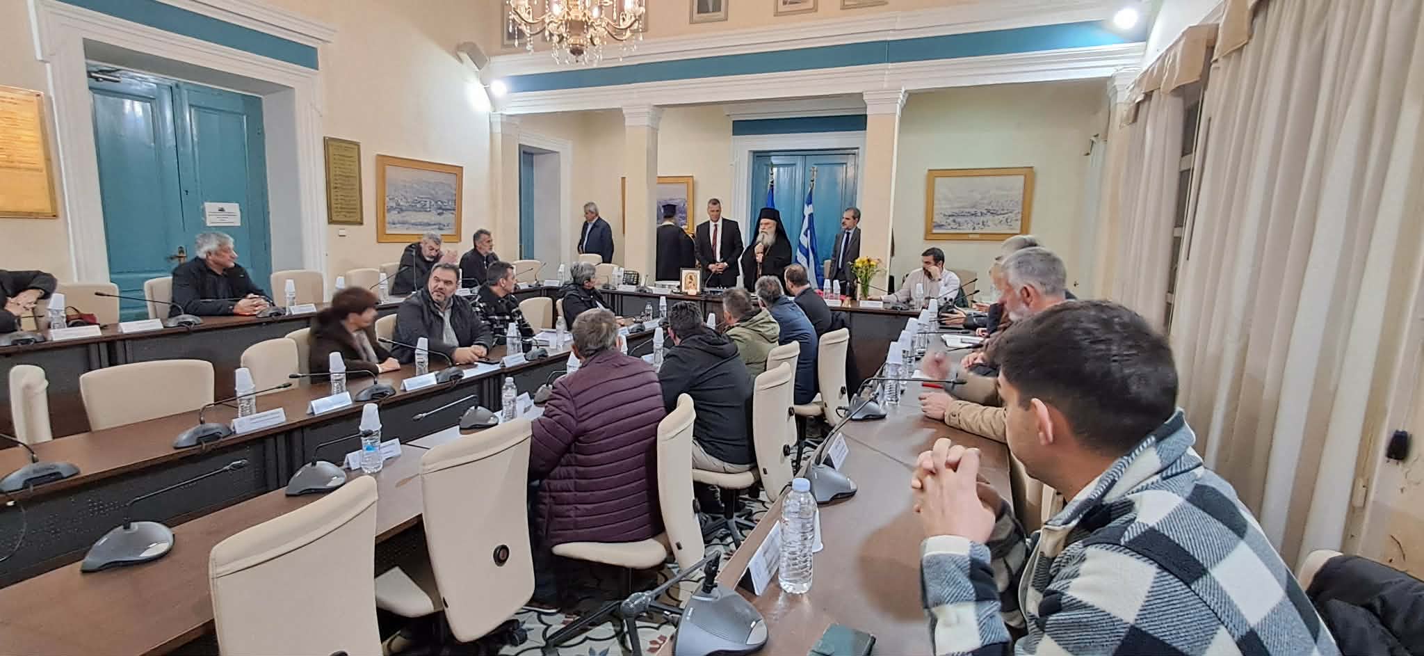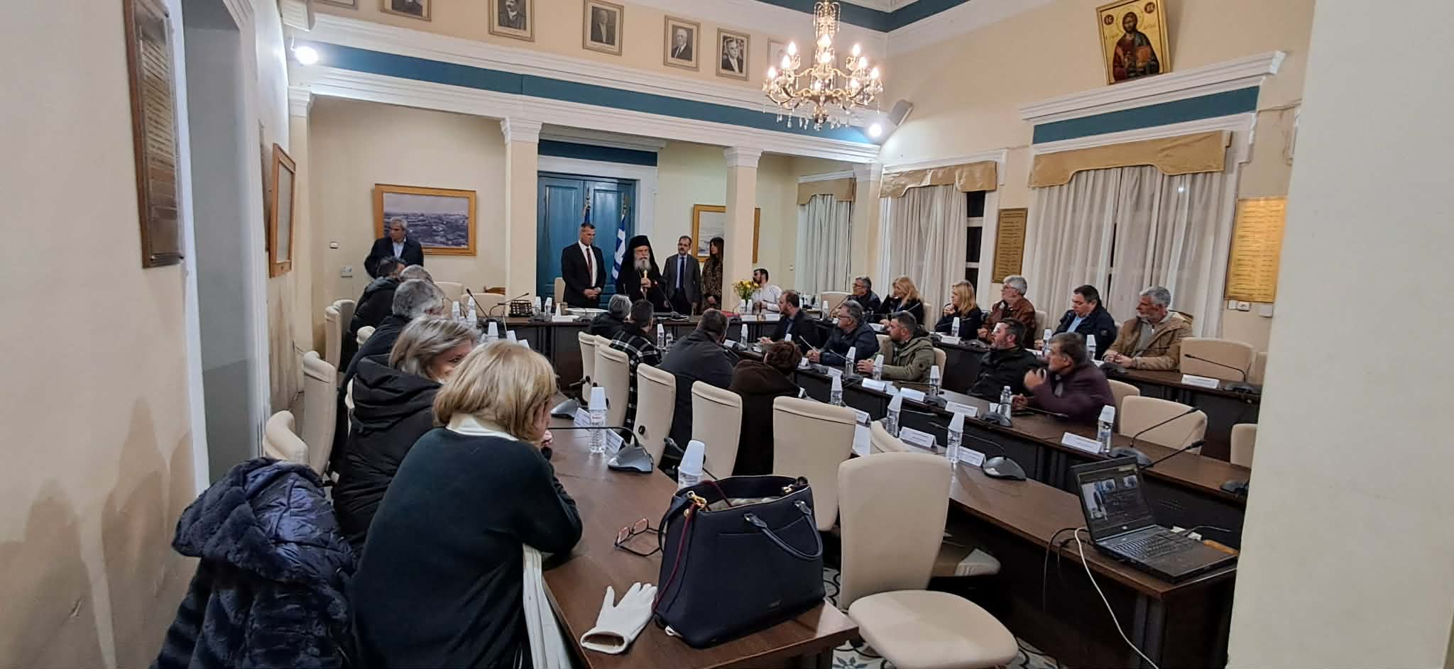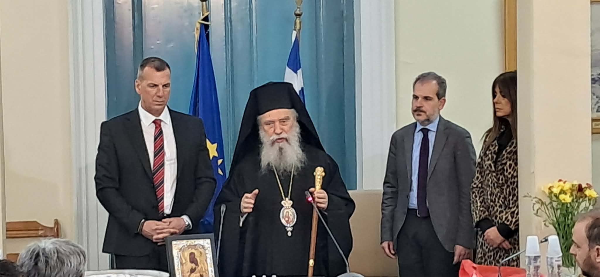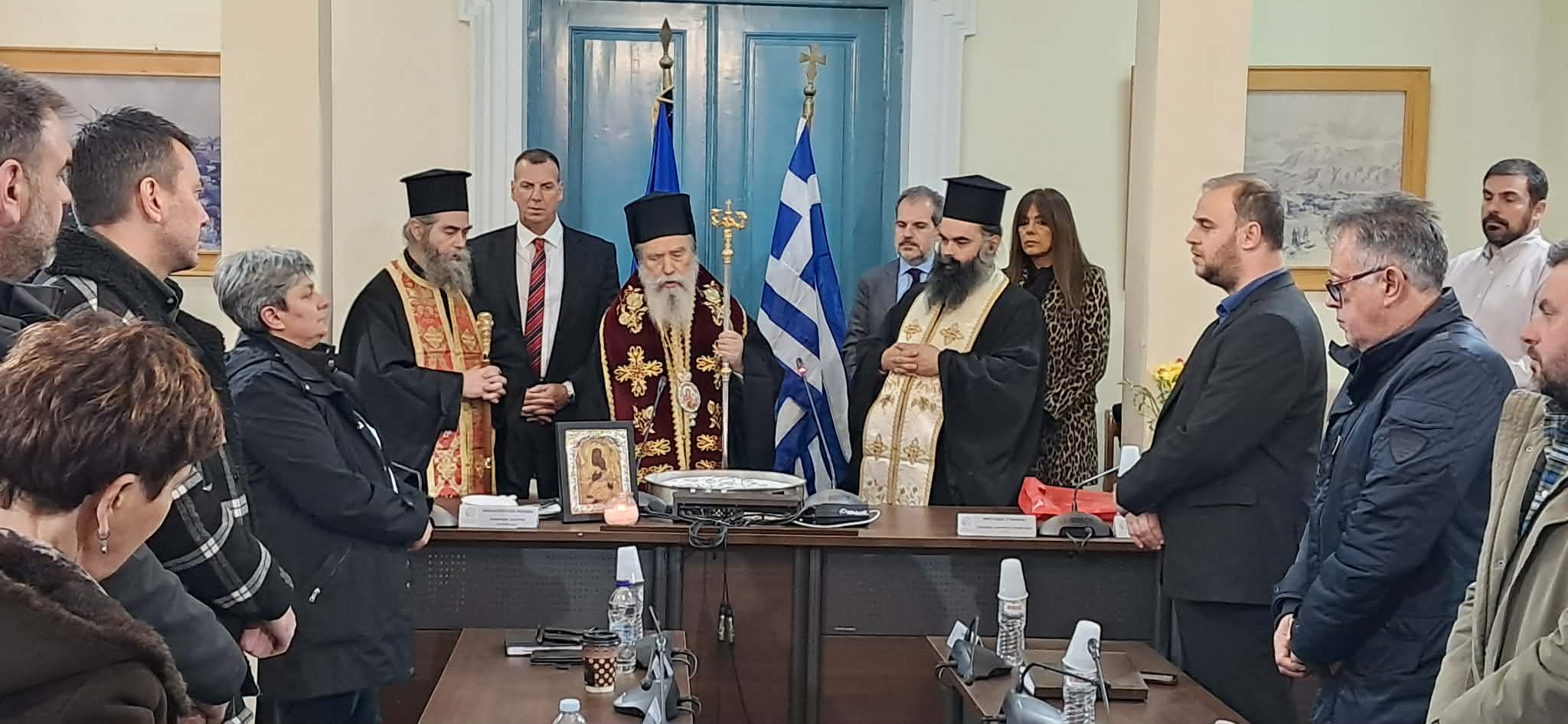 Λίγο πριν την έναρξη της συνεδρίασης του Δημοτικού Συμβουλίου, ο Σεβασμιώτατος ευλόγησε τη Βασιλόπιτα και απευθυνόμενος προς τα μέλη του Συμβουλίου ευχήθηκε καλή και δημιουργική χρονιά, γεμάτη πρωτίστως Υγεία.